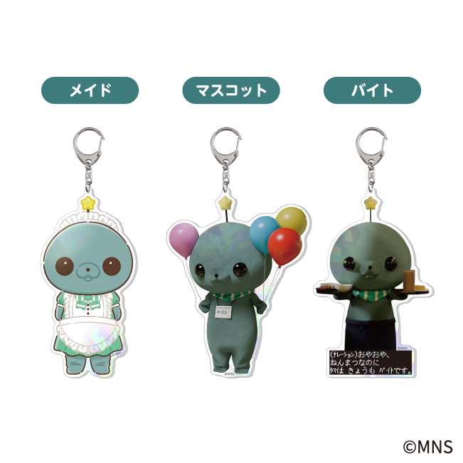 年末バイトするタマの3種類のアクリルキーホルダーです。