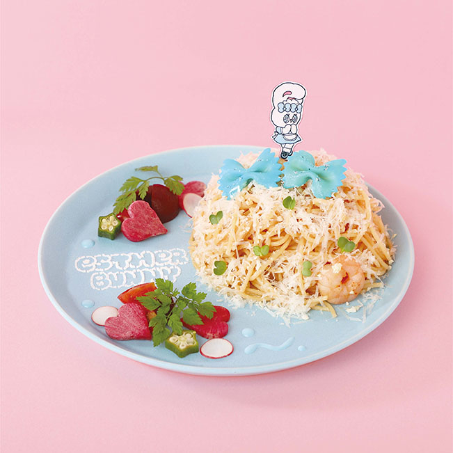クリームバニーをイメージした、濃厚なたらこクリームパスタ。プリプリのエビもトッピング。アイコニックなブルーリボンのパスタにキラキラを✧
