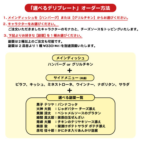 メインディッシュとキャラクターカラーのソース、副菜が選べる楽しいデリプレートです。