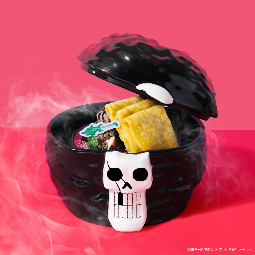 ホールケーキアイランド編で、ビッグ・マムが持つ“ロード歴史の本文”の写しを華麗にゲットしたブルックの名シーンを、クレープをのせたビタースイートなデザートボウルで再現。中身はクレープに、バニラ・チョコレートアイスにビスケットや、チョコ、エスプレッソです。リアルなブルックの頭型の器に入れて、ご提供いたします。